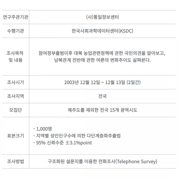 “대북 농업지원”에 대한 국민 여론조사 페이지 정보 작성일 11-07-11 11:29 본문 위의 자료는 KSDC DB에서 열람하실 수 있습니다. 관련링크 https://ksdcdb.kr/ 440회 연결 목록 이전글2004년 신년특집 여론조사 11.07.11 다음글교통안전진단 결과분석 및 사고요인 분석모델 도출 11.07.11
