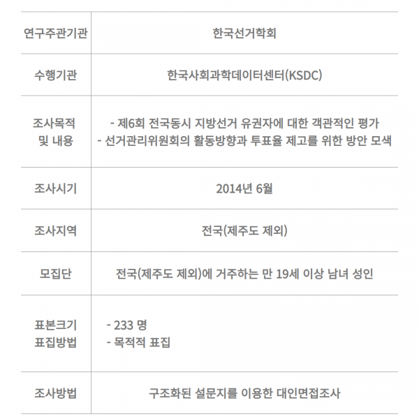 제6회 전국동시 지방선거 관련 유권자 정치의식조사(2014) 페이지 정보 작성일 17-11-10 14:01 본문 위의 자료는 KSDC DB에서 열람하실 수 있습니다. 관련링크 https://ksdcdb.kr/ 561회 연결 목록 이전글학생자치법정 운영 실태조사(중고등학생) 17.11.10 다음글GM작물 관련 대국민 인식 조사연구(2014) 17.11.10